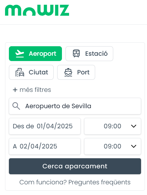 - Quan accedeixis a la pàgina d'inici de MoWiz, podràs seleccionar on necessites aparcar; en un aeroport, en un port , en una estació de tren o en una ciutat. Si per exemple vols fer la reserva en algun pàrquing d'aeroport, només has de fer clic en les opcions del cercador “aeroport”, posar el nom de l'aeroport en qüestió, prémer a "Buscar pàrquing" introduint les dates i hores d'entrada i sortida del pàrquing. (Recorda que les dates i hores que et demanem són les d'entrada i sortida del pàrquing, i no les del teu vol.)