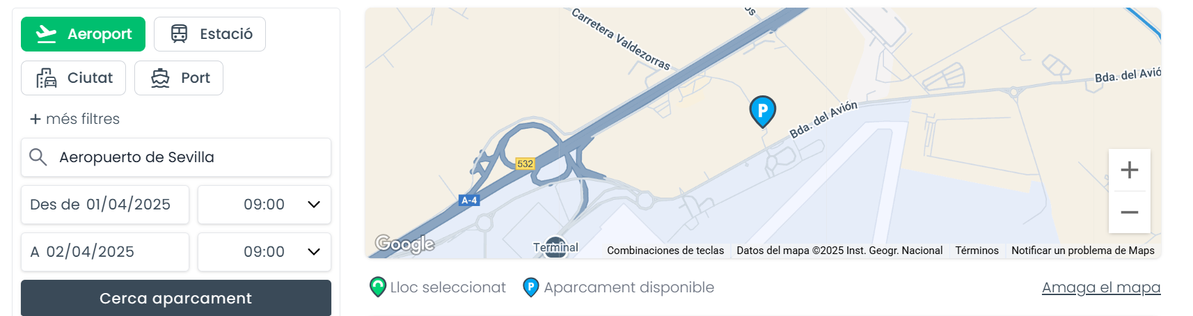 - De la mateixa manera, podràs veure en el mapa la localització dels diferents pàrquings respecte de l'aeroport, port, estació de tren o ciutat, així com la direcció, les característiques bàsiques i les condicions d'estada i trasllats del pàrquing.