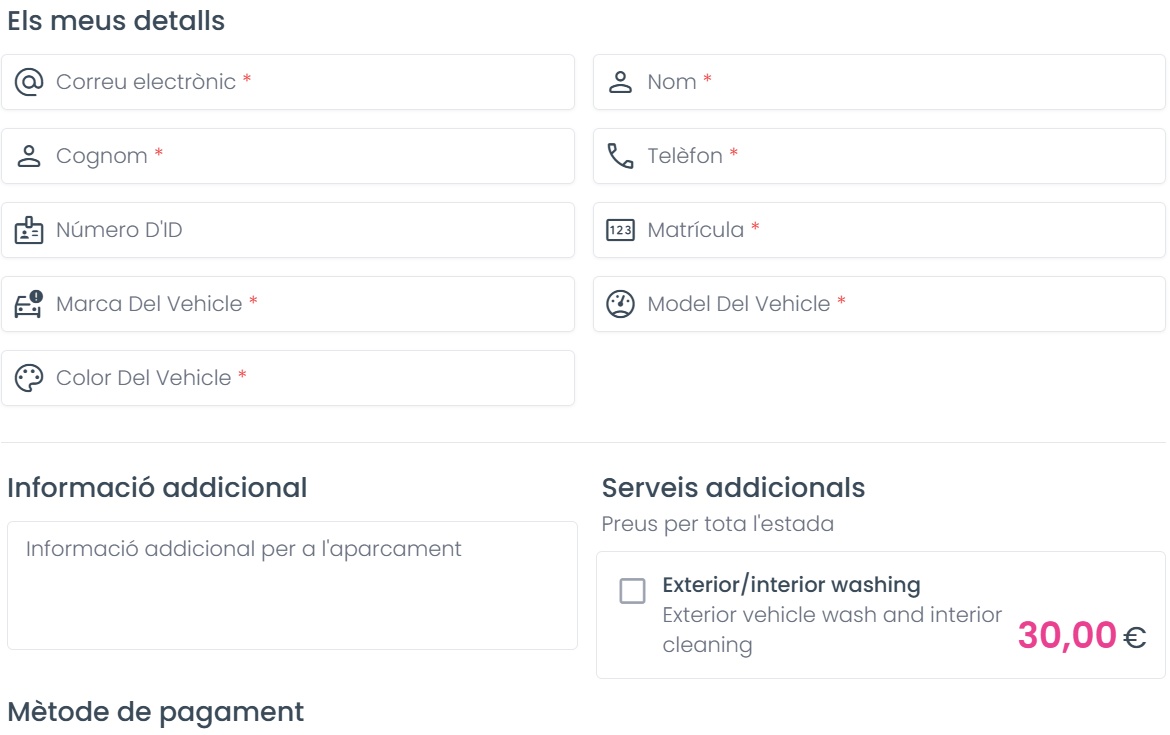 - Completa el formulari, posant especial atenció a introduir almenys les dades requerides, que estan marcats amb un asterisc (). Les dades obligatòries a subministrar varien d'un pàrquing a un altre i són necessaris perquè cadascun dels nostres pàrquings afiliats pugui oferir el seu millor servei.