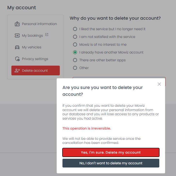 When you click on "delete my account" you will receive a confirmation message to delete your account. We require you to confirm the deletion since it is an irreversible process.