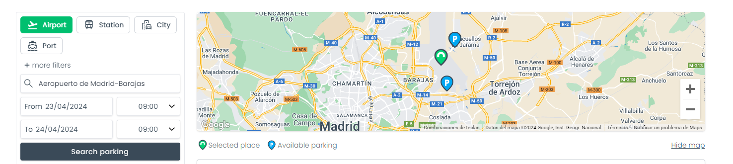 - You will also be able to see on the map the location of the different car parks with respect to the airport, port, train station or city, as well as the address, the basic characteristics and the conditions of stay and transfers of the car park.