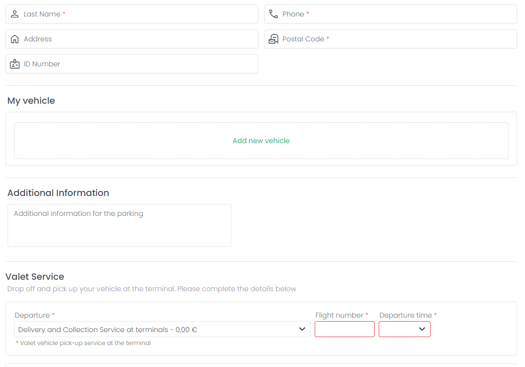 - Complete the form, paying special attention to enter at least the required data, which are marked with an asterisk (*). The mandatory data to be provided vary from one car park to another and are necessary for each of our affiliated car parks to be able to offer the best service.