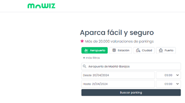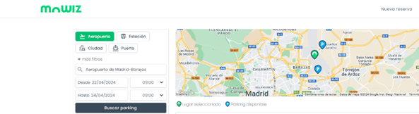 - Aceda à página inicial do mowiz e selecione a localização: aeroporto, porto, estação de comboios ou cidade. Introduza as datas e horas de entrada e saída do estacionamento (não do voo) e clique em Procurar estacionamento para rever a lista de parques de estacionamento disponíveis segundo serviços, tarifas e localização.